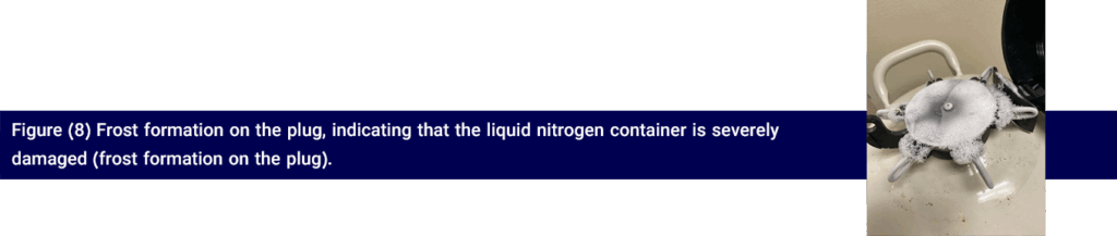 Frost around the lid suggests a slow vacuum leak, commonly seen in older tanks. To prevent further damage to the flask’s contents, immediate repair or replacement should be considered.